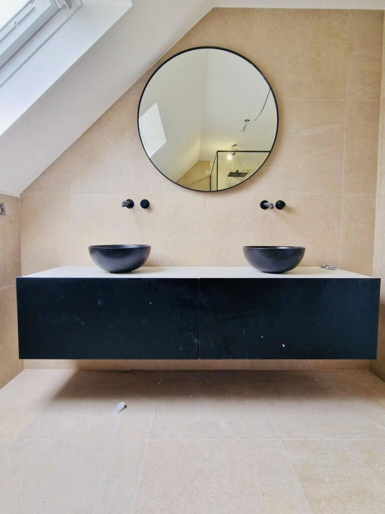 Ce projet met en valeur notre expertise dans la création d’espaces fonctionnels et esthétiques, même dans des configurations atypiques. Les vasques noires et la robinetterie minimaliste apportent une touche contemporaine, tandis que le grand miroir rond adoucit les lignes et amplifie la lumière naturelle. Le choix des matériaux et des finitions témoigne de notre engagement envers la qualité et la durabilité.