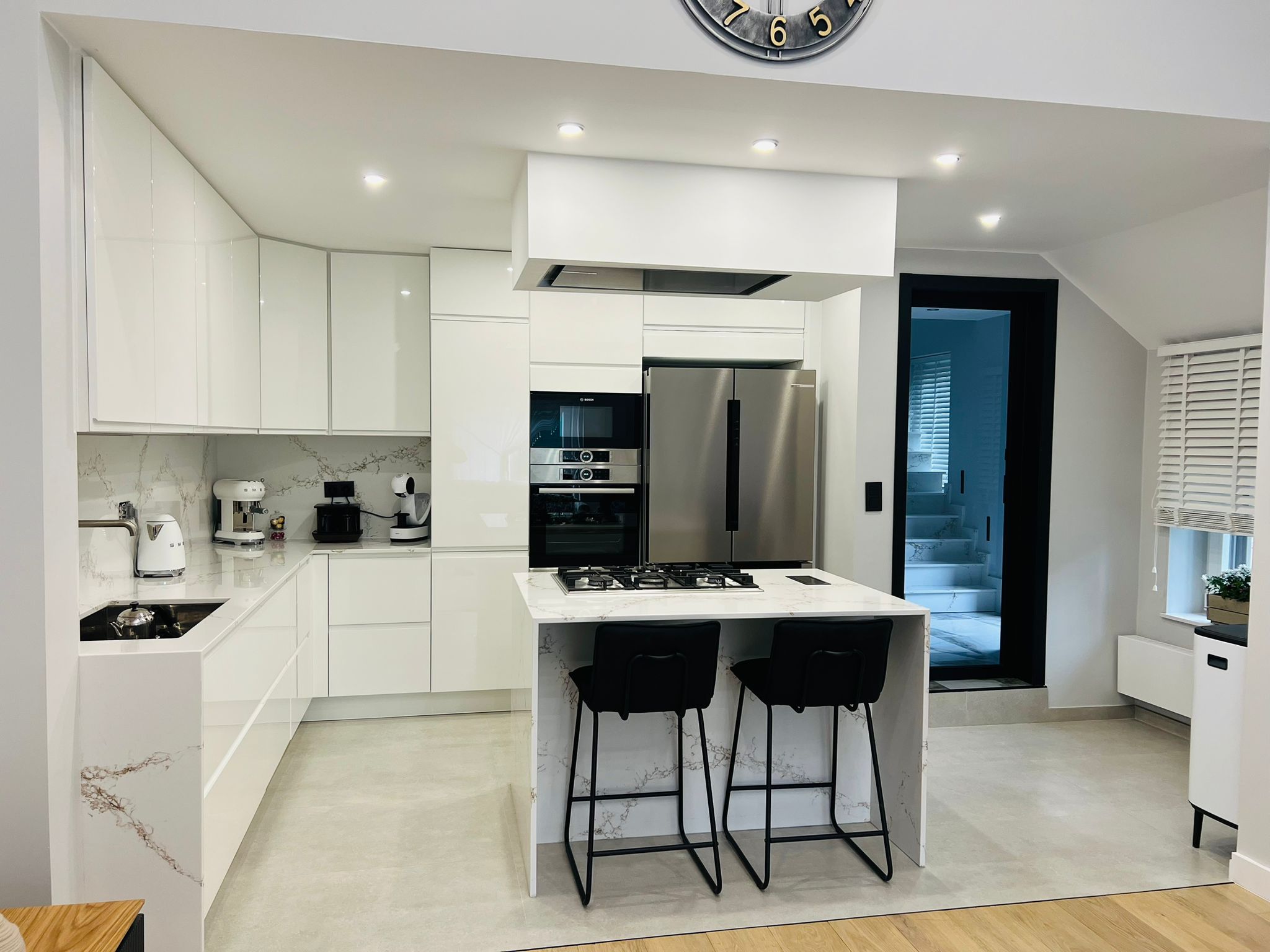 - Électroménagers intégrés : Four, micro-ondes et réfrigérateur encastrés pour un design harmonieux et épuré.